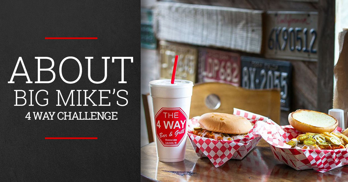 Big Mike’s 4 Way Challenge isn’t for the faint-of-heart — or stomach. In fact, the challenge is a great eating feat. In 20 minutes, you’ll have to eat: